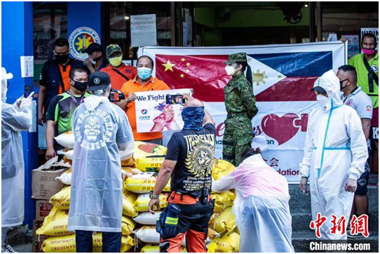 捐贈(zèng)現(xiàn)場,以紫色雨衣作為防護(hù)衣的志愿者,將一袋袋大米捐贈(zèng)給菲律賓基層社區(qū)。宣傳版上是緊握的兩只手,繪以中菲兩國國旗,口號(hào)是“WE FIGHT AS ONE!”